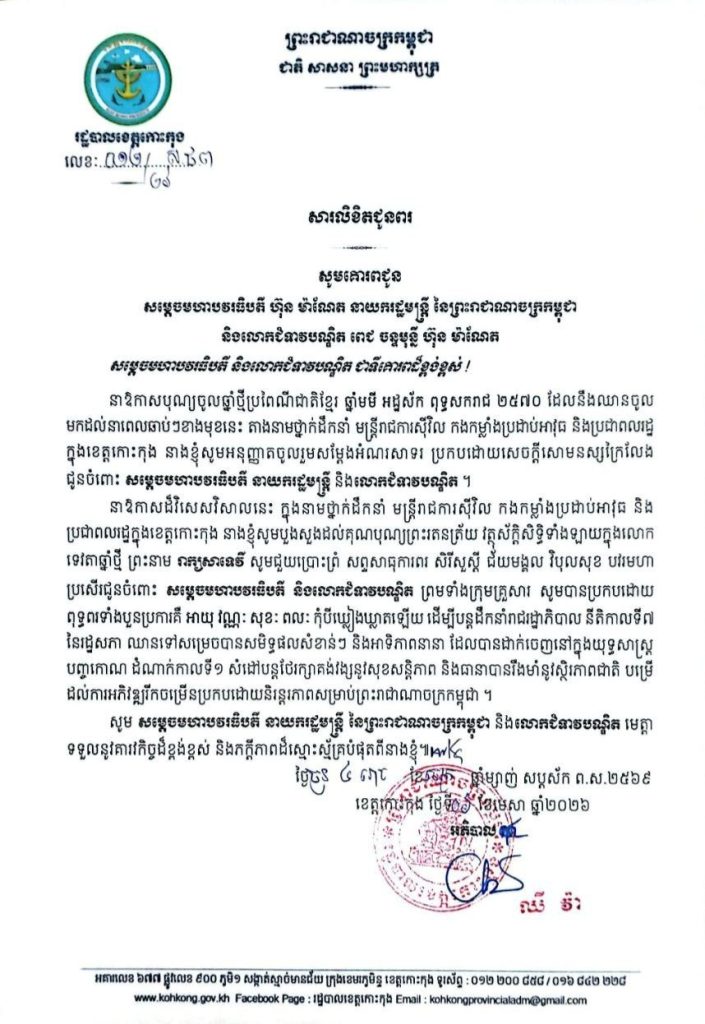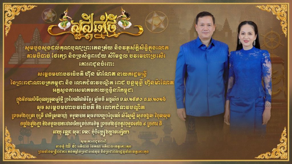 សារលិខិតជូនពរ សូមគោរពជូន សម្តេចមហាបវរធិបតី ហ៊ុន ម៉ាណែត នាយករដ្ឋមន្ត្រី នៃព្រះរាជាណាចក្រកម្ពុជា និងលោកជំទាវបណ្ឌិត ពេជ ចន្ទមុន្នី ហ៊ុន ម៉ាណែត នាឱកាសបុណ្យចូលឆ្នាំថ្មីប្រពៃណីជាតិខ្មែរ ឆ្នាំមមី អដ្ឋស័ក ពុទ្ធសករាជ ២៥៧០ ដែលនឹងឈានចូល មកដល់នាពេលឆាប់ៗខាងមុខនេះ