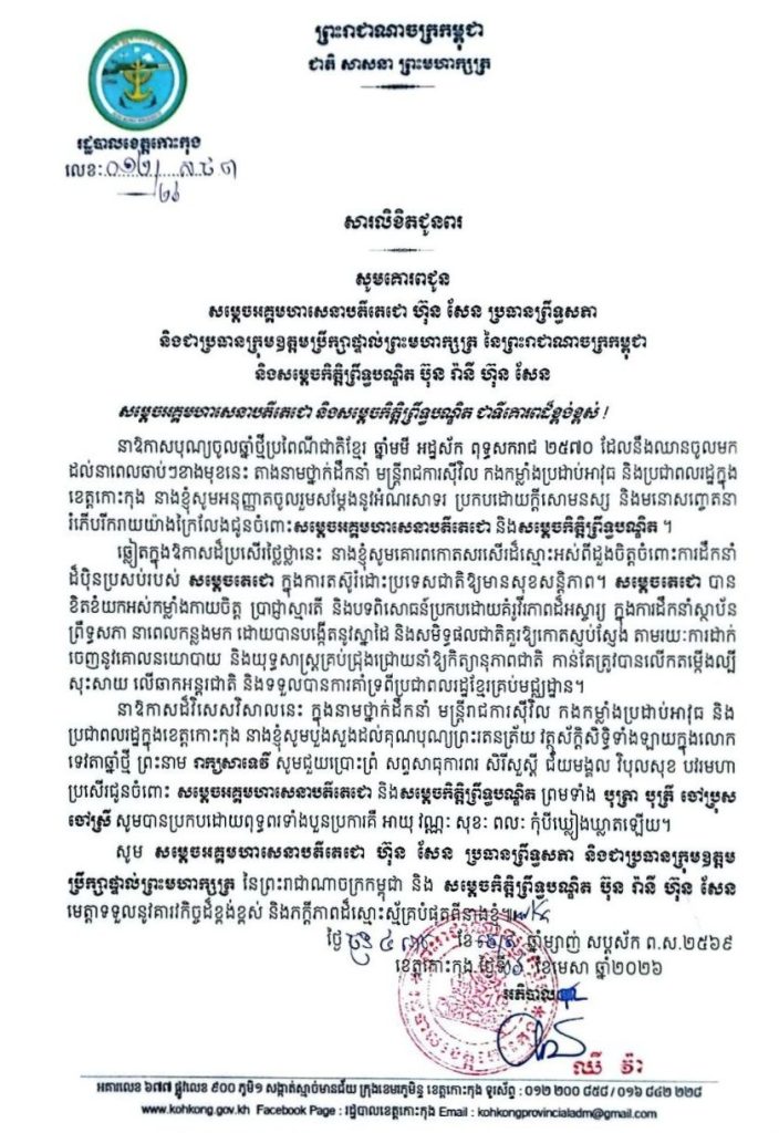 សារលិខិតជូនពរ សូមគោរពជូន សម្តេចអគ្គមហាសេនាបតីតេជោ ហ៊ុន សែន ប្រធានព្រឹទ្ធសភា និងជាប្រធានក្រុមឧត្តមប្រឹក្សាផ្ទាល់ព្រះមហាក្សត្រ នៃព្រះរាជាណាចក្រកម្ពុជា និងសម្តេចកិត្តិព្រឹទ្ធបណ្ឌិត ប៊ុន រ៉ានី ហ៊ុន សែន នាឱកាសបុណ្យចូលឆ្នាំថ្មីប្រពៃណីជាតិខ្មែរ ឆ្នាំមមី អដ្ឋស័ក ពុទ្ធសករាជ ២៥៧០ ដែលនឹងឈានចូល មកដល់នាពេលឆាប់ៗខាងមុខនេះ
