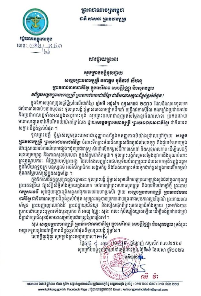 សារថ្វាយព្រះពរ សូមក្រាបបង្គំទូលថ្វាយ សម្តេចព្រះមហាក្សត្រី នរោត្តម មុនិនាថ សីហនុ ព្រះវររាជមាតាជាតិខ្មែរ ក្នុងសេរីភាព សេចក្តីថ្លៃថ្នូរ និងសុភមង្គល ក្នុងឱកាសបុណ្យចូលឆ្នាំថ្មីប្រពៃណីជាតិខ្មែរ ឆ្នាំមមី អដ្ឋស័ក ពុទ្ធសករាជ ២៥៧០ ដែលនឹងឈានចូលមក ប់នាពេលឆាប់ៗខាងមុខនេះ