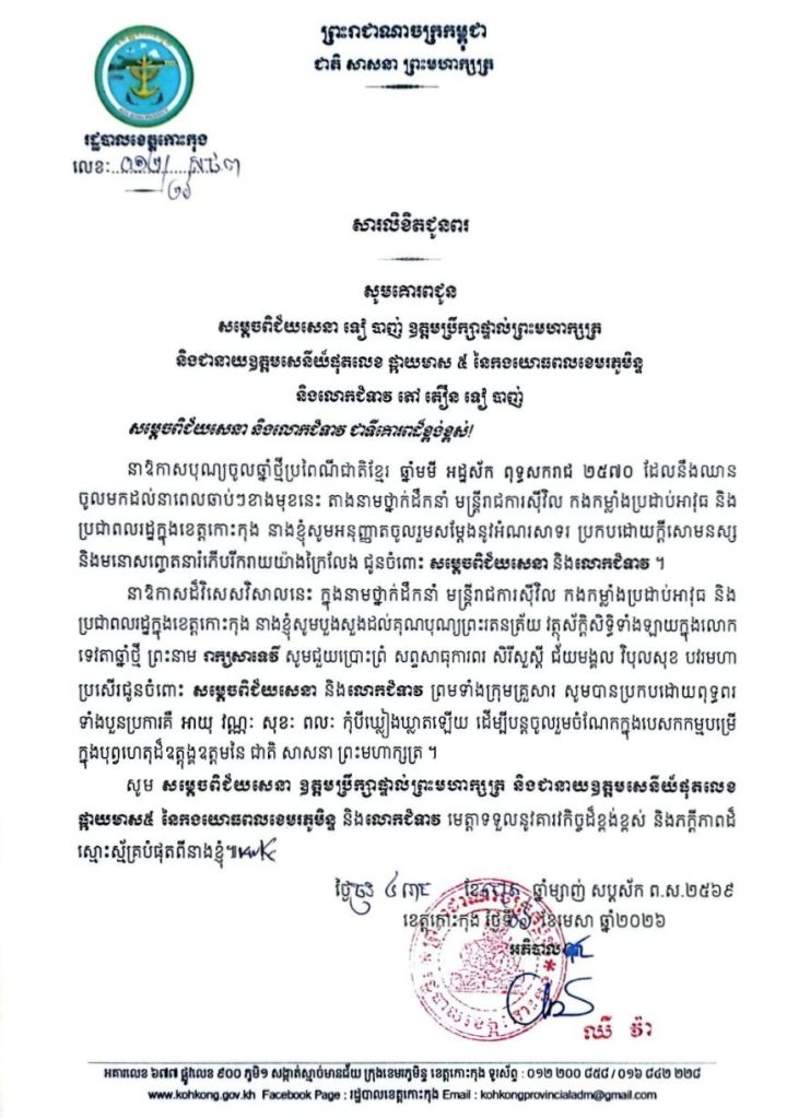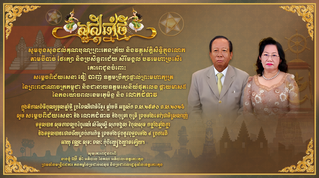 សារលិខិតជូនពរ សូមគោរពជូន សម្តេចពិជ័យសេនា ទៀ បាញ់ ឧត្តមប្រឹក្សាផ្ទាល់ព្រះមហាក្សត្រ និងជានាយឧត្តមសេនីយ៍ផុតលេខ ផ្កាយមាស ៥ នៃកងយោធពលខេមរភូមិន្ទ និងលោកជំទាវ តៅ តឿន ទៀ បាញ់ នាឱកាសបុណ្យចូលឆ្នាំថ្មីប្រពៃណីជាតិខ្មែរ ឆ្នាំមមី អដ្ឋស័ក ពុទ្ធសករាជ ២៥៧០ ដែលនឹងឈាន ចូលមកដល់នាពេលឆាប់ៗខាងមុខនេះ