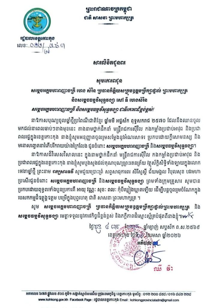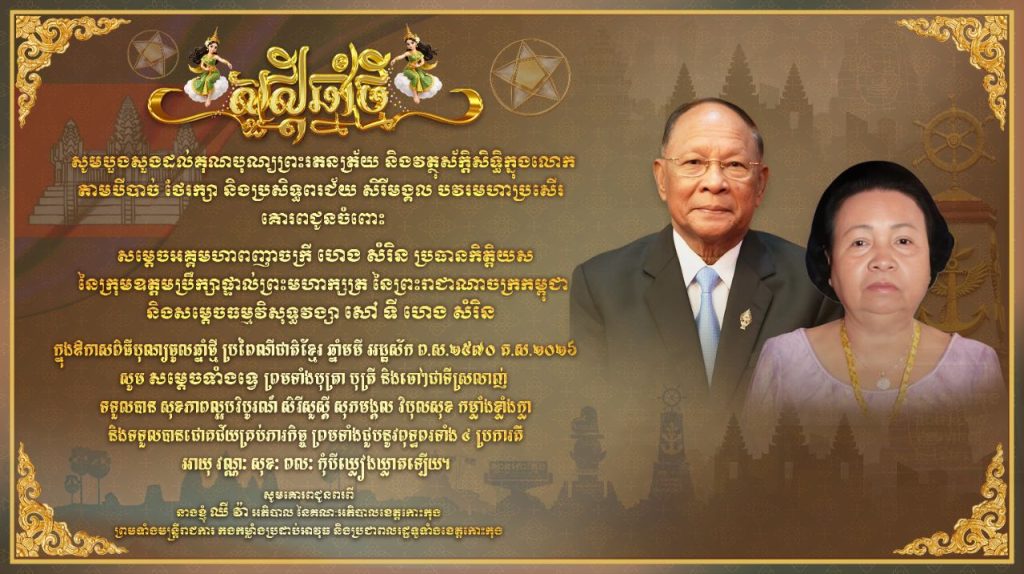 សារលិខិតជូនពរ សូមគោរពជូន សម្តេចអគ្គមហាពញាចក្រី ហេង សំរិន ប្រធានកិត្តិយសក្រុមឧត្តមប្រឹក្សាផ្ទាល់ ព្រះមហាក្សត្រ និងសម្តេចធម្មវិសុទ្ធវង្សា សៅ ទី ហេងសំរិន នាឱកាសបុណ្យចូលឆ្នាំថ្មីប្រពៃណីជាតិខ្មែរ ឆ្នាំមមី អដ្ឋស័ក ពុទ្ធសករាជ ២៥៧០ ដែលនឹងឈានចូល មកដល់នាពេលឆាប់ៗខាងមុខនេះ