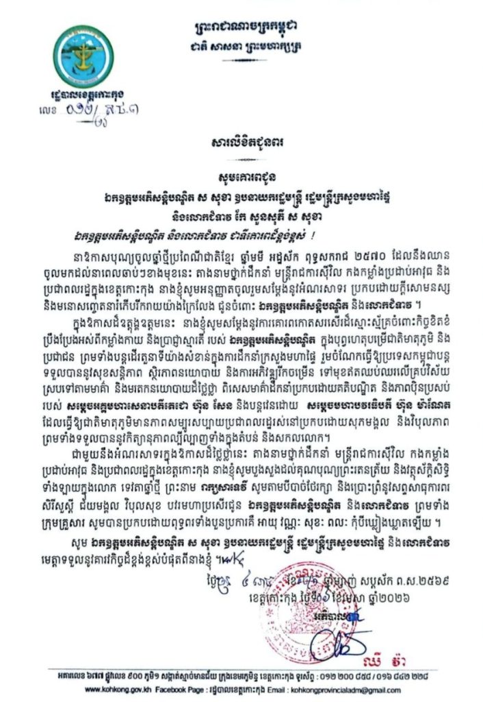 សារលិខិតជូនពរ សូមគោរពជូន ឯកឧត្តមអភិសន្តិបណ្ឌិត ស សុខា ឧបនាយករដ្ឋមន្ត្រី រដ្ឋមន្ត្រីក្រសួងមហាផ្ទៃ និងលោកជំទាវ កែ សួនសុភី ស សុខា នាឱកាសបុណ្យចូលឆ្នាំថ្មីប្រពៃណីជាតិខ្មែរ ឆ្នាំមមី អដ្ឋស័ក ពុទ្ធសករាជ ២៥៧០ ដែលនឹងឈាន ចូលមកដល់នាពេលឆាប់ៗខាងមុខនេះ