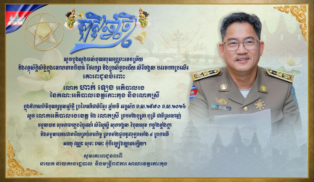 សូមគោរពជូនចំពោះ លោក ហាក់ ឡេង អភិបាលរង នៃគណៈអភិបាលខេត្តកោះកុង និងលោកស្រី ក្នុងឱកាសពិធីបុណ្យចូលឆ្នាំថ្មី ប្រពៃណីជាតិខ្មែរ ឆ្នាំមមី អដ្ឋស័ក ព.ស.២៥៧០ គ.ស.២០២៦
