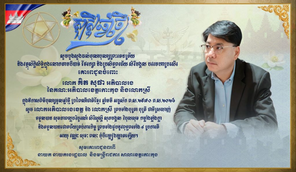 សារលិខិតជូនពរសូមគោរពជូនចំពោះ លោក គិត សុផា អភិបាលរង នៃគណៈអភិបាលខេត្តកោះកុង និងលោកស្រី ក្នុងឱកាសពិធីបុណ្យចូលឆ្នាំថ្មី ប្រពៃណីជាតិខ្មែរ ឆ្នាំមមី អដ្ឋស័ក ព.ស.២៥៧០ គ.ស.២០២៦សូមគោរពជូនពរពី នាយក នាយករងរដ្ឋបាល និងមន្ត្រីរាជការសាលាខេត្តកោះកុង