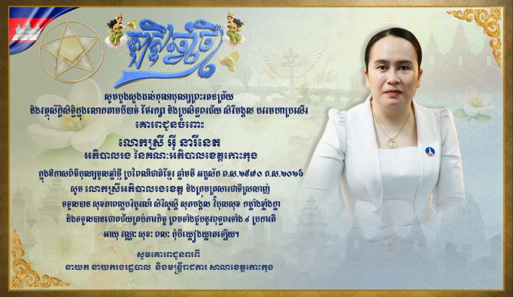 សារលិខិតជូនពរសូមគោរពជូនចំពោះ លោកស្រី អ៉ី នារីនេត អភិបាលរង នៃគណៈអភិបាលខេត្តកោះកុង ក្នុងឱកាសពិធីបុណ្យចូលឆ្នាំថ្មី ប្រពៃណីជាតិខ្មែរ ឆ្នាំមមី អដ្ឋស័ក ព.ស.២៥៧០ គ.ស.២០២៦សូមគោរពជូនពរពី នាយក នាយករងរដ្ឋបាល និងមន្ត្រីរាជការសាលាខេត្តកោះកុង