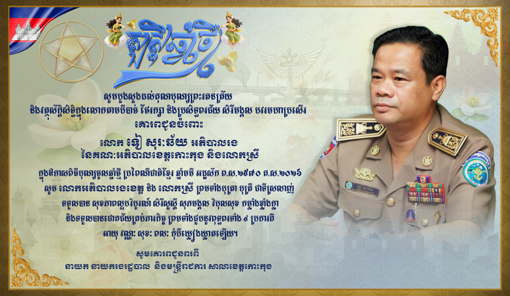 សារលិខិតជូនពរ សូមគោរពជូនចំពោះ លោក ទៀ សុរៈឆ័យ អភិបាលរង នៃគណៈអភិបាលខេត្តកោះកុង និងលោកស្រី ក្នុងឱកាសពិធីបុណ្យចូលឆ្នាំថ្មី ប្រពៃណីជាតិខ្មែរ ឆ្នាំមមី អដ្ឋស័ក ព.ស.២៥៧០ គ.ស.២០២៦ សូមគោរពជូនពរពី នាយក នាយករងរដ្ឋបាល និងមន្ត្រីរាជការសាលាខេត្តកោះកុង