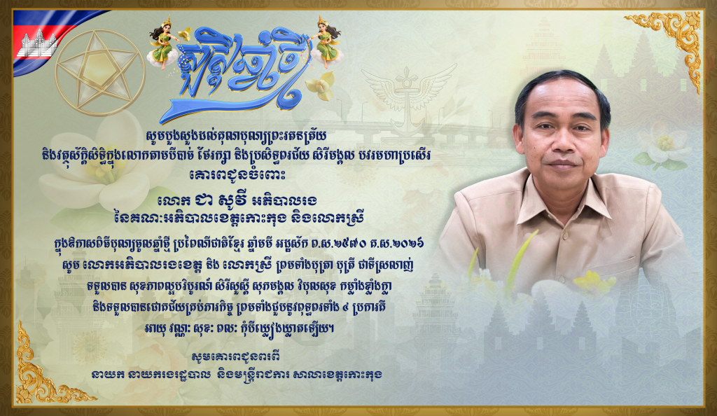 សារលិខិតជូនពរ សូមគោរពជូនចំពោះ លោក ជា សូវី អភិបាលរង នៃគណៈអភិបាលខេត្តកោះកុង និងលោកស្រី ក្នុងឱកាសពិធីបុណ្យចូលឆ្នាំថ្មី ប្រពៃណីជាតិខ្មែរ ឆ្នាំមមី អដ្ឋស័ក ព.ស.២៥៧០ គ.ស.២០២៦ សូមគោរពជូនពរពី នាយក នាយករងរដ្ឋបាល និងមន្ត្រីរាជការសាលាខេត្តកោះកុង
