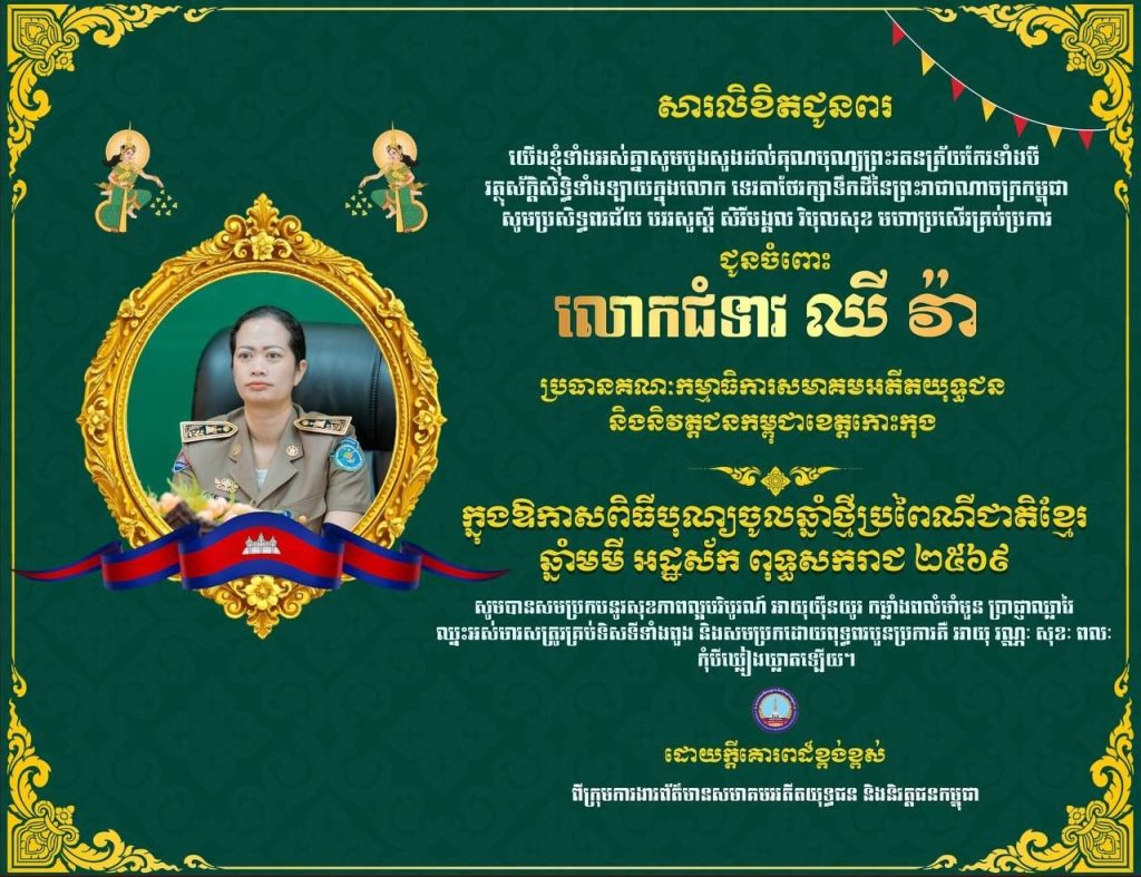 សារលិខិតជូនពរ យើងខ្ញុំទាំងអស់គ្នាសូមបួងសួងដល់គុណបុណ្យព្រះរតនត្រ័យកែវទាំងបី វត្ថុស័ក្តិសិទ្ធិទាំងឡាយ ក្នុងលោក ទេវតាថែរក្សាទឹកដី នៃព្រះរាជាណាចក្រកម្ពុជា សូមប្រសិទ្ធពរជ័យ បវរសួស្តី សិរីមង្គល វិបុលសុខ មហាប្រសើរគ្រប់ប្រការ ជូនចំពោះ លោកជំទាវ ឈី វ៉ា ប្រធានគណៈកម្មាធិការសមាគមអតីតយុទ្ធជន និងនិវត្តជនកម្ពុជាខេត្តកោះកុង ដោយក្តីគោរពដ៏ខ្ពង់ខ្ពស់ពីក្រុមការងារព័ត៌មានសមាគមអតីតយុទ្ធជន និងនិវត្តជនកម្ពុជា