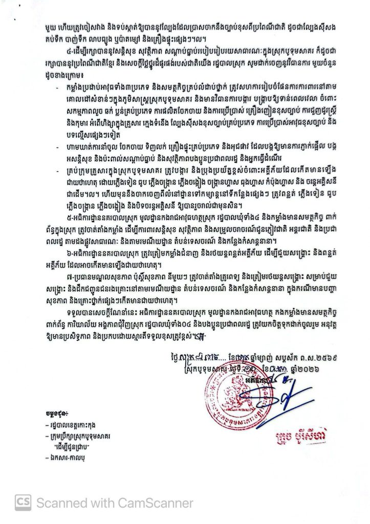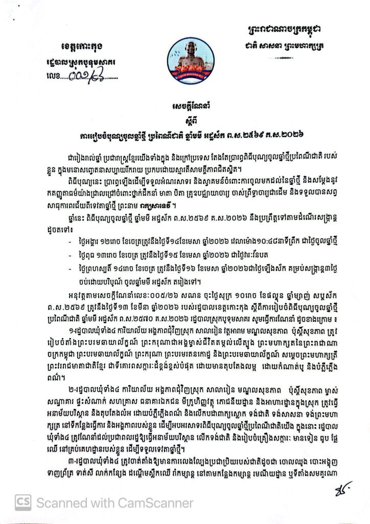 សេចក្ដីណែនាំ ស្ដីពីការរៀបចំបុណ្យចូលឆ្នាំថ្មី ប្រពៃណីជាតិ ឆ្នាំមមី អដ្ឋស័ក ព.ស.២៥៦៩ គ.ស.២០២៦