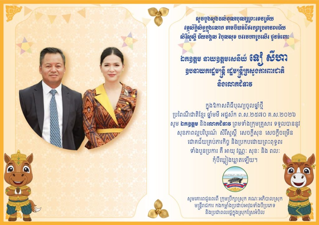 ក្រុមប្រឹក្សាស្រុក គណៈអភិបាលស្រុក មន្ត្រីរាជការ កងកម្លាំងប្រដាប់អាវុធទាំងបីប្រភេទ និងប្រជាពលរដ្ឋក្នុងស្រុកស្រែអំបិល សូមបួងសួងដល់គុណបុណ្យព្រះរតនត្រ័យ វត្ថុស័ក្តិសិទ្ធក្នុងលោក តាមបីបាច់ថែរក្សាប្រទានពរជ័យ សិរីសួស្ដី ជ័យមង្គល វិបុលសុខ បវរមហាប្រសើរ ជូនចំពោះ ឯកឧត្តម នាយឧត្តមសេនីយ៍ ទៀ សីហា និងលោកជំទាវ ព្រមទាំងក្រុមគ្រួសារ ក្នុងឱកាសពិធីបុណ្យចូលឆ្នាំថ្មី ប្រពៃណីជាតិខ្មែរ