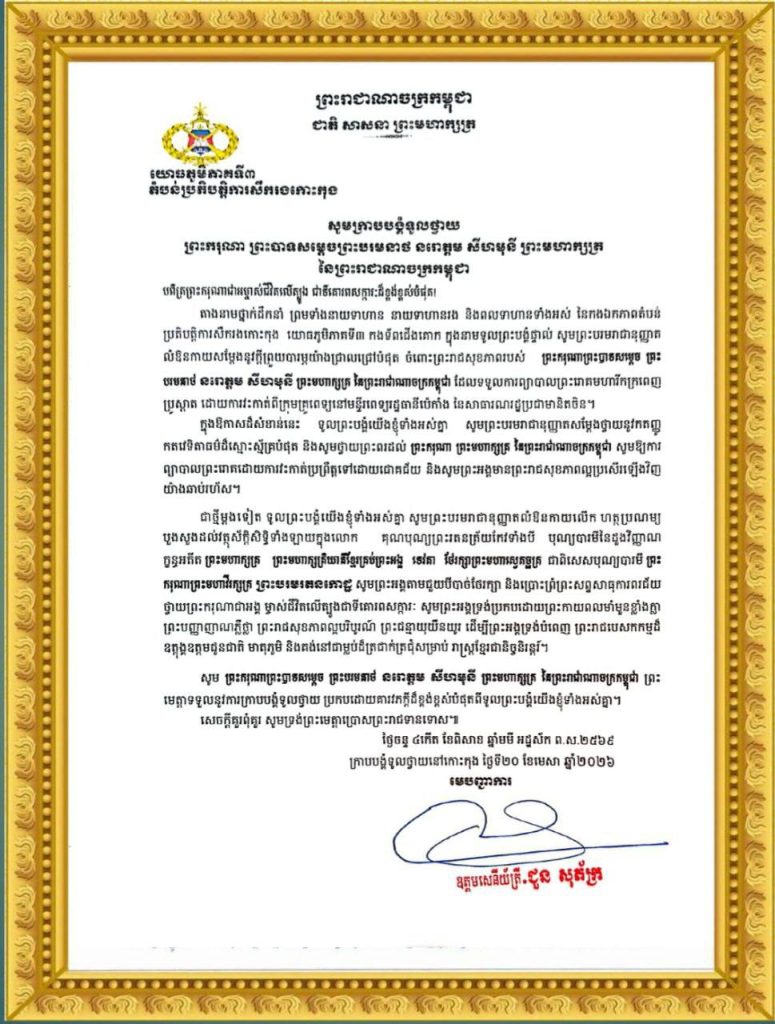 ឧត្តមសេនីយ៍ត្រី ជួន សុភ័ក្រ មេបញ្ជាការ ព្រមទាំងនាយទាហាន នាយទាហានរង ពលទាហាន ទូទាំងកងឯកភាពតំបន់ប្រតិបត្តិការសឹករងកោះកុង ក្រាបបង្គំទូលថ្វាយព្រះពរ ថ្វាយ ព្រះករុណាព្រះបាទសម្តេចព្រះបរមនាថ នរោត្តម សីហមុនី ព្រះមហាក្សត្រនៃព្រះរាជាណាចក្រកម្ពុជា