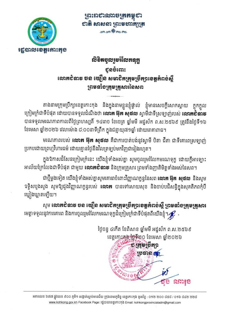 ក្រុមប្រឹក្សាខេត្តកោះកុង សូមចូលរួមរំលែកទុក្ខដ៏ក្រៀមក្រំបំផុតជាមួយលោកជំទាវ ចន យឿន សមាជិកក្រុមប្រឹក្សាខេត្តកំពង់ស្ពឺ ដែលបានបាត់បង់ស្វាមីជាទីគោរពស្រឡាញ់