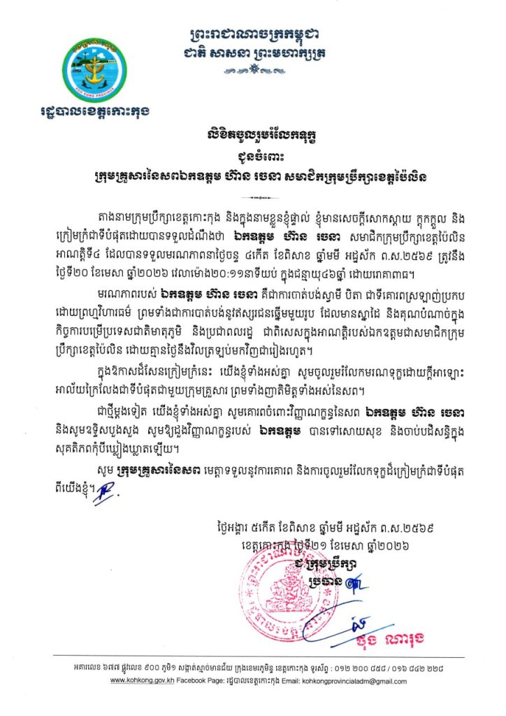 ក្រុមប្រឹក្សាខេត្តកោះកុង សូមចូលរួមរំលែកទុក្ខដ៏ក្រៀមក្រំបំផុតជាមួយ​ក្រុមគ្រួសារនៃសពឯកឧត្ដម ហ៊ាន រចនា សមាជិកក្រុមប្រឹក្សាខេត្តប៉ែលិន