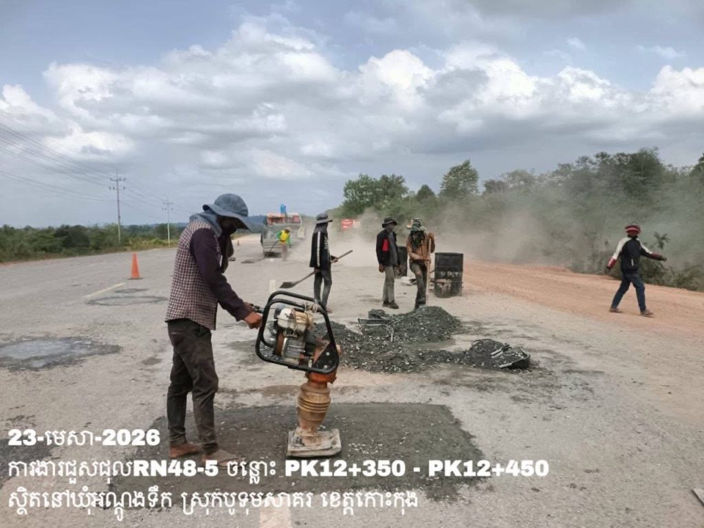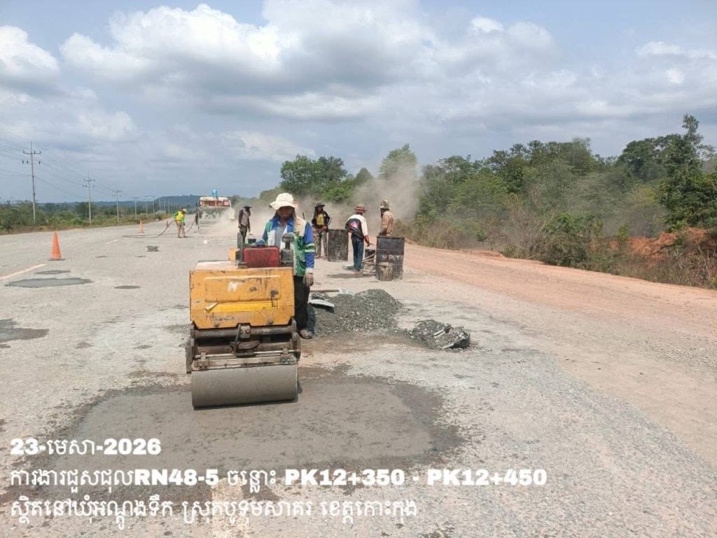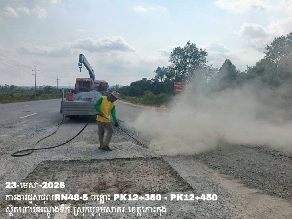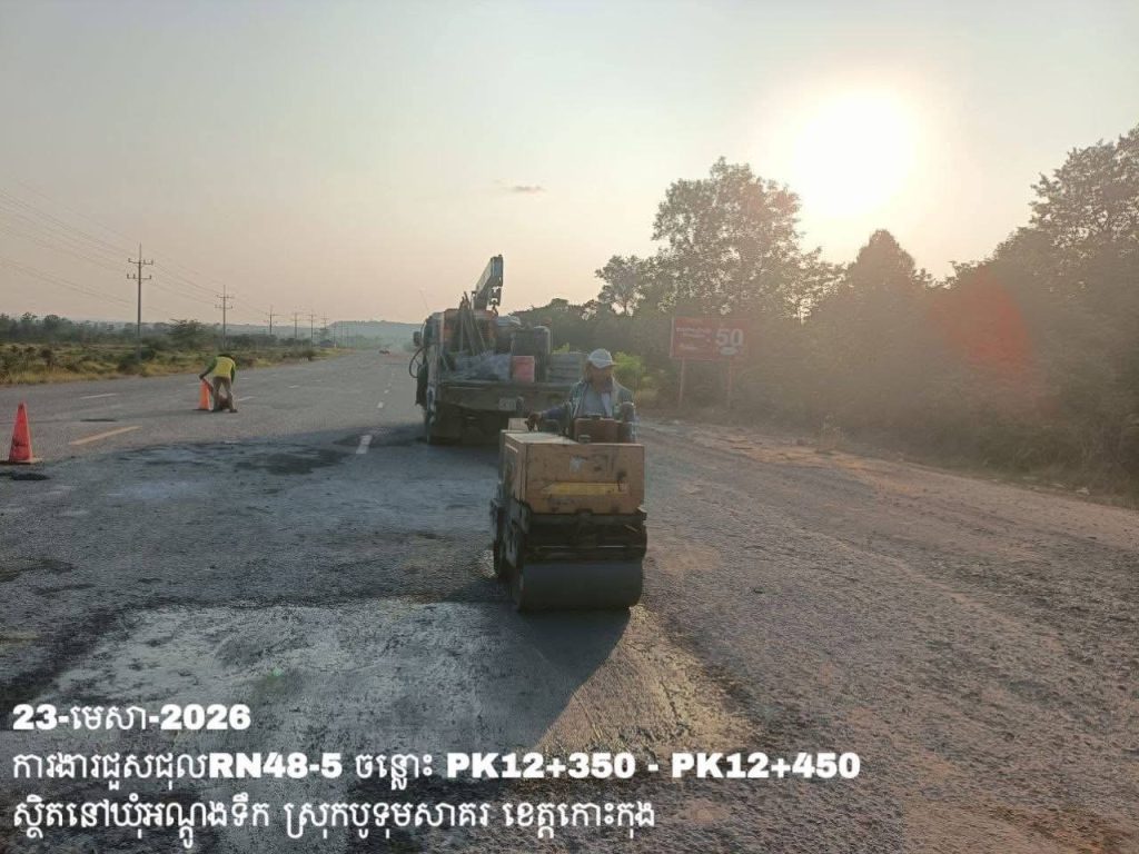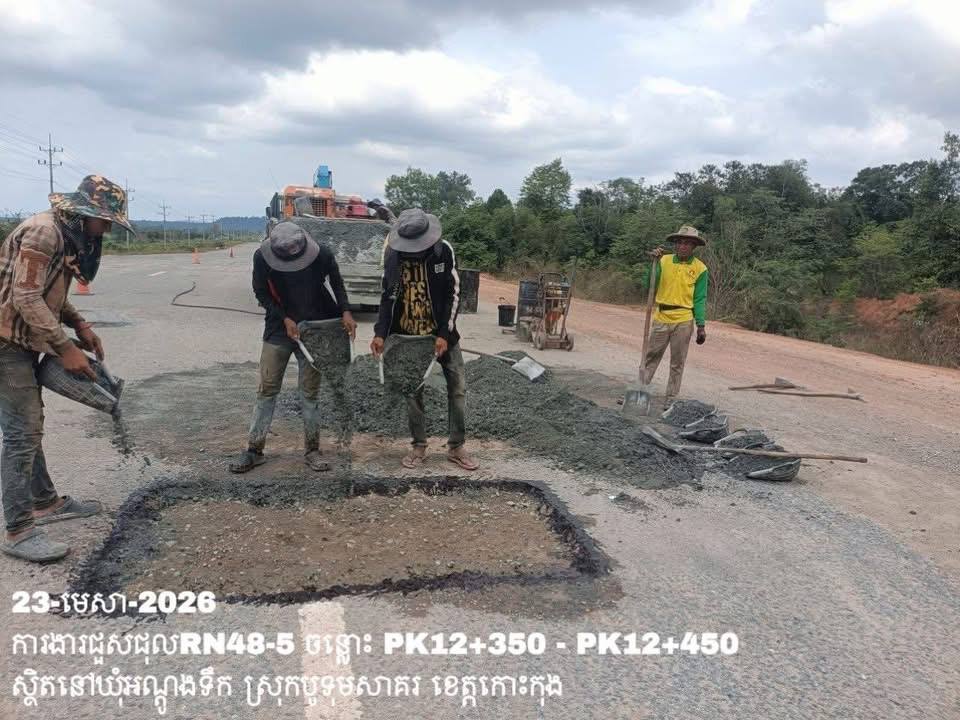 -បន្តការងារថែទាំប្រចាំលើផ្លូវជាតិលេខ 48-5 ឃុំអណ្ដូងទឹក ស្រុកបូទុមសាគរ ខេត្តកោះកុង សកម្មភាពការងារជួសជុលសំបុកមាន់ ដោយប្រើល្បាយថ្មម៉ិច ជាមួយស៊ីម៉ង់ត៍ និងកៅស៊ូ CRS-2 ត្រង់ចន្លោះ PK12+350 – PK12+450។