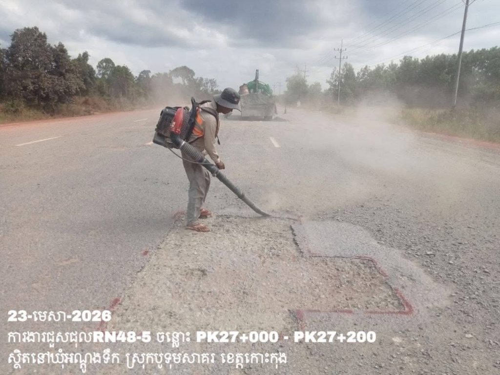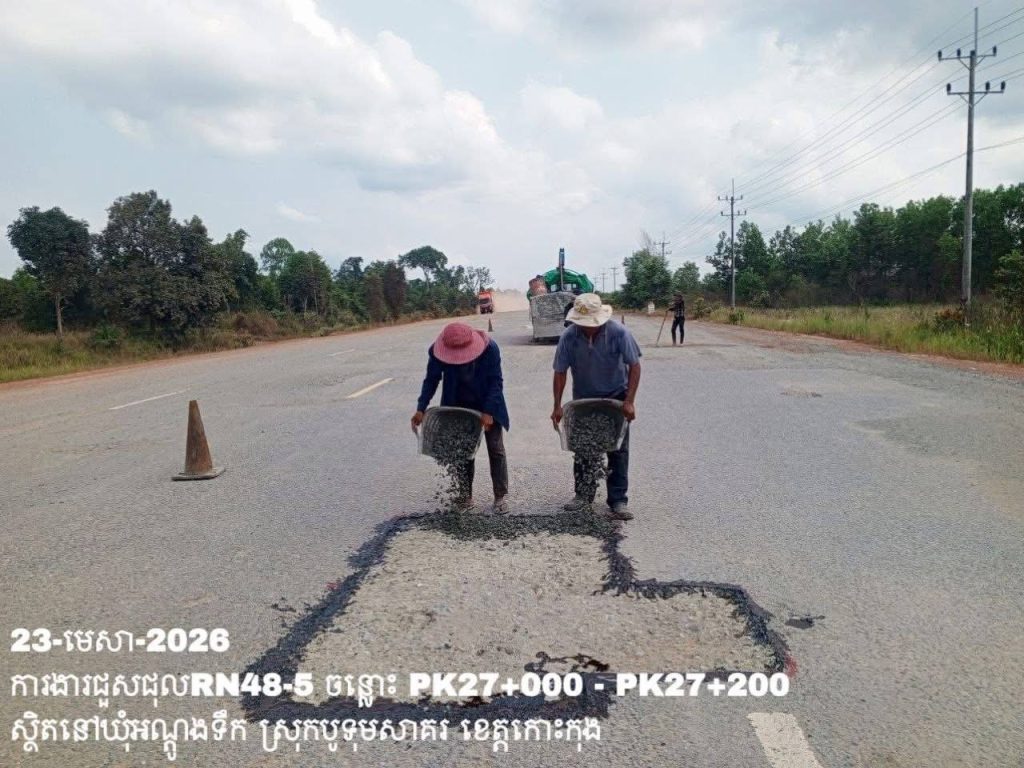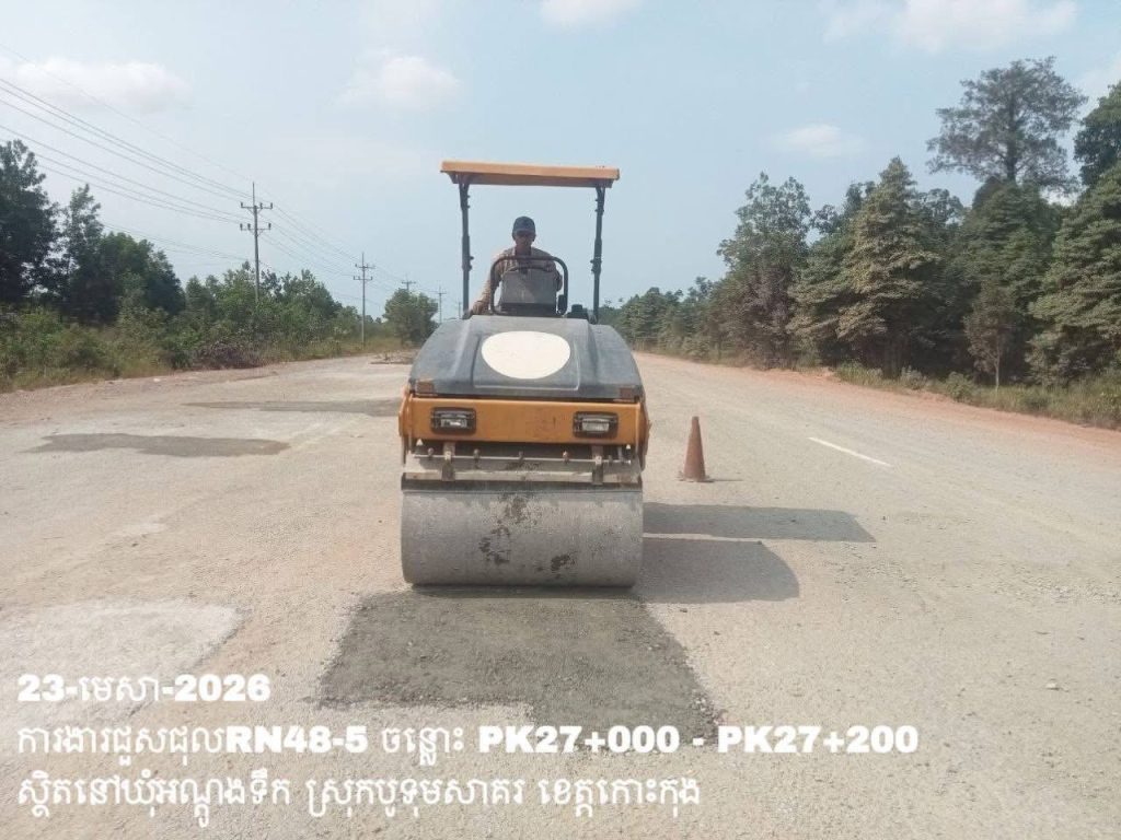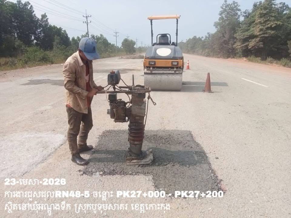-បន្តការងារថែទាំប្រចាំលើផ្លូវជាតិលេខ 48-5 ឃុំអណ្ដូងទឹក ស្រុកបូទុមសាគរ ខេត្តកោះកុង សកម្មភាពការងារជួសជុលសំបុកមាន់ ដោយប្រើល្បាយថ្មម៉ិច ជាមួយស៊ីម៉ង់ត៍ និងកៅស៊ូ CRS-2 ត្រង់ចន្លោះ PK27+000 – PK27+200។