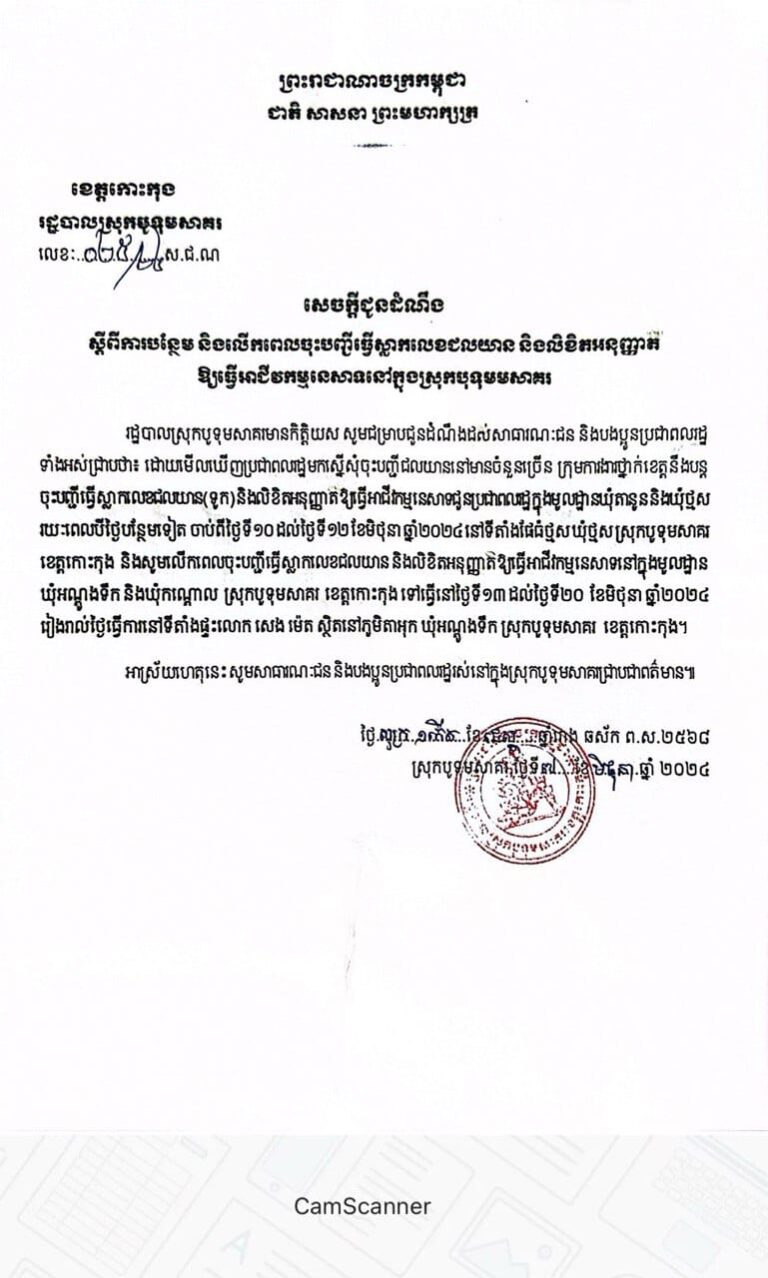 សេចក្ដីជូនដំណឹង ស្ដីពីការបន្ថែម និងលើកពេលវេលាចុះបញ្ជីស្លាកលេខជលយាន និងផ្ដល់លិខិតអនុញ្ញាតឱ្យធ្វើអាជីវកម្មនេសាទ នៅក្នុងស្រុកបូទុមសាគរ ខេត្តកោះកុង