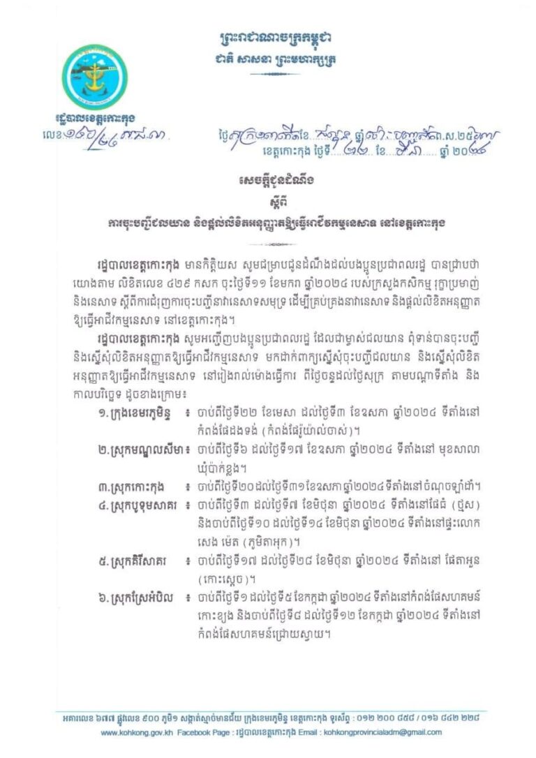 សេចក្តីជូនដំណឹង ស្តីពី ការចុះបញ្ជីជលយាន និងផ្តល់លិខិតអនុញ្ញាតឱ្យធ្វើអាជីវកម្មនេសាទ នៅខេត្តកោះកុង