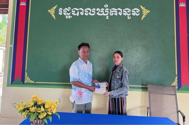 លោក សំឡាន សិរិ មេឃុំស្ដីទី បានផ្ដល់កាតវីងជូនស្ដ្រីក្រីក្រមានផ្ទៃពោះម្នាក់ឈ្មោះ ហាង ឌី ដែលមានទីលំនៅបច្ចុប្បន្នស្ថិតនៅភូមិទួលពោធិ៍ ឃុំតានូន ស្រុកបូទុមសាគរ ខេត្តកោះកុង