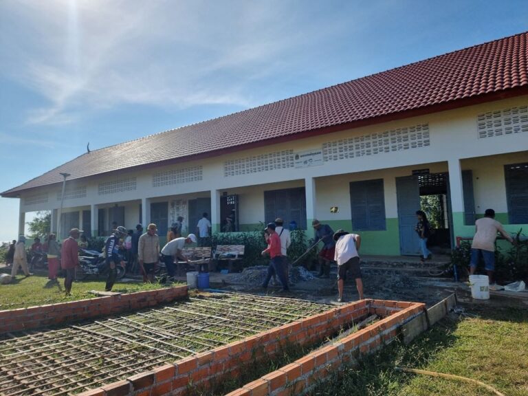 លោក សន ប៊ុនធឿន មេភូមិតាឃ បានដឹកនាំក្រុមការងារភូមិ ចូលរួមសហការជាមួយ គណៈគ្រប់គ្រងសាលា នាយកសាលា លោកគ្រ-អ្នកគ្រូ ព្រមទាំងប្រជាពលរដ្ឋក្នុងភូមិ បានចាក់សាបបេតុងក្រាលនៅខាងមុខថ្នាក់រៀន ដងទង់ជាតិ ដើម្បីសម្រួលដល់ការគោរពទង់ជាតិ