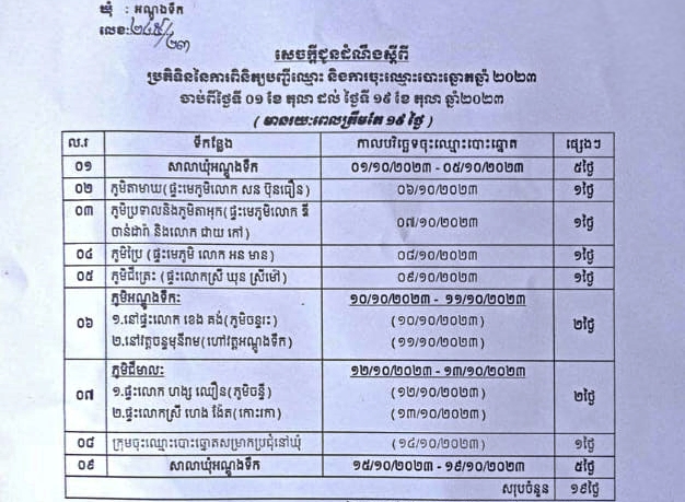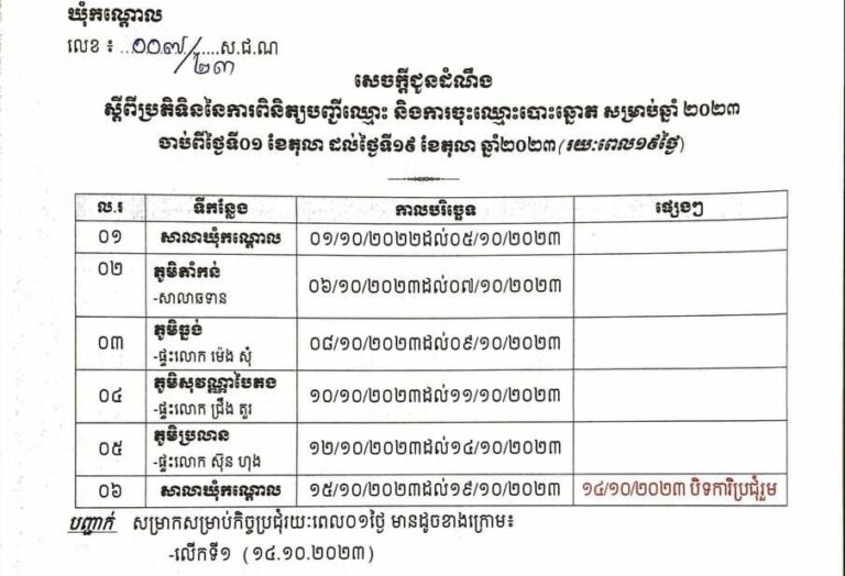 សេចក្តីជូនដំណឹង ស្តីពីប្រតិទិននៃការពិនិត្យបញ្ជីឈ្មោះ និងការចុះឈ្មោះបោះឆ្នោតសម្រាប់ឆ្នាំ២០២៣ ចាប់ពីថ្ងៃទី១ ដល់ថ្ងៃទី១៩ ខែតុលា ឆ្នាំ២០២៣ (រយៈពេល១៩ថ្ងៃ) នៅតាមបណ្តាភូមិទាំង ៥ស្ថិតនៅក្នុងឃុំកណ្តោល ស្រុកបូទុមសាគរ ខេត្តកោះកុង