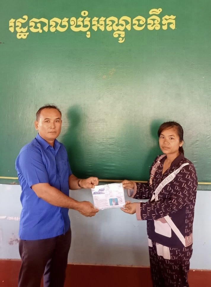 លោក យិន យួត ជំទប់ទី១ បានអញ្ជើញផ្តល់កាតវីងជូនស្ត្រីមានផ្ឌៃពោះឈ្មោះ ឆៅ វ៉ាន់នី អាយុ៣២ឆ្នាំ ដែលមានជីវភាពក្រីក្រ (មានប័ណ្ណសមធម៌) ទីលំនៅបច្ចុប្បន្នភូមិអណ្តូងទឹក ឃុំអណ្តូងទឹក ស្រុកបូទុមសាគរ ខេត្តកោះកុង ដើម្បីយកទៅប្រើប្រាស់តាមការណែនាំរបស់មណ្ឌលសុខភាព