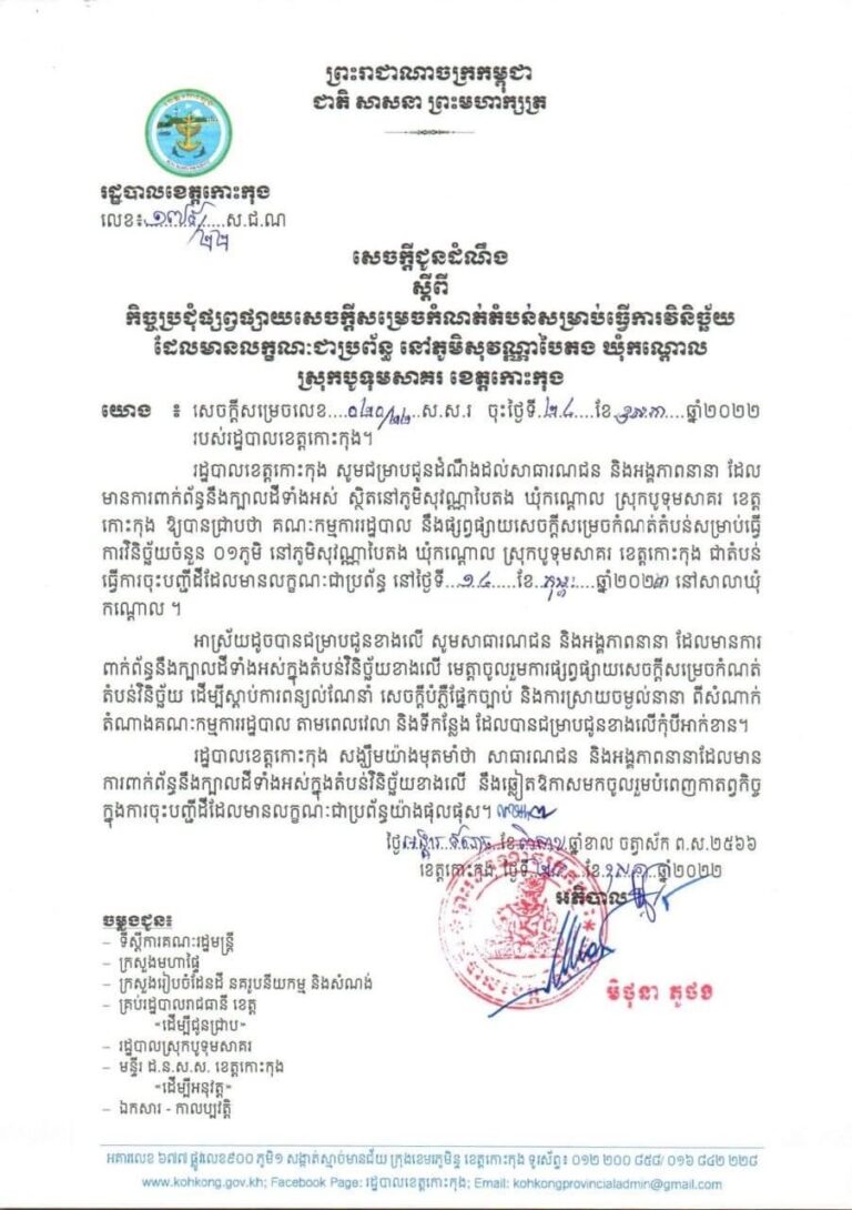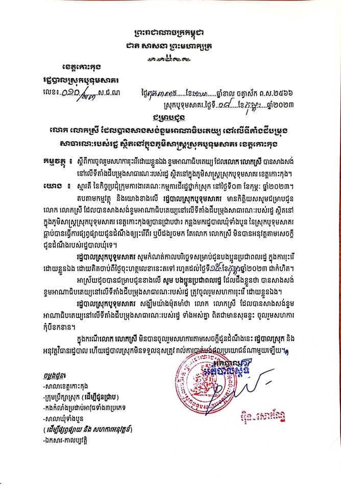សេចក្តីជូនដំណឹងលេខ០១០/២៣ ស.ជ.ណ ចុះថ្ងៃទី០៨ ខែ ឆ្នាំ២០២៣ របស់រដ្ឋបាលស្រុកបូទុមសាគរ ស្តីពីការចូលរួមសហការរុះរើដោយខ្លួនឯង ខ្ទមអាណាធិបតេយ្យ ដែលលោក លោកស្រី បានសាងសង់នៅលើទីតាំងដីបម្រុងសាធារណៈរបស់រដ្ឋ ស្ថិតនៅក្នុងភូមិសាស្ត្រស្រុកបូទុមសាគរ ខេត្តកោះកុង