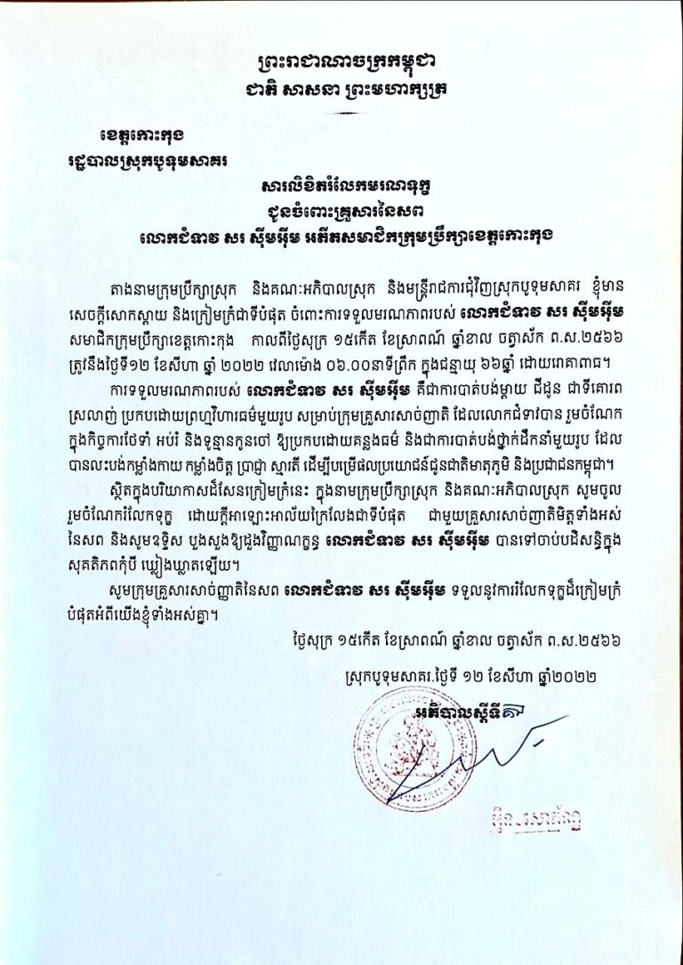 តាងនាមក្រុមប្រឹក្សាស្រុក និងគណៈអភិបាលស្រុក និងមន្ត្រីរាជការជុំវិញស្រុក នៃរដ្ឋបាលស្រុកបូទុមសាគរ សូមចូលរួមរំលែកទុក្ខដ៏ក្រៀមក្រំ និងសំដែងនូវការសោកស្ដាយជាទីបំផុតចំពោះការបាត់បង់ដ៏ធំធេង លោកជំទាវ សរ ស៊ីមអ៊ីម សមាជិកក្រុមប្រឹក្សាខេត្តកោះកុង