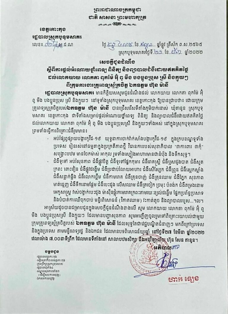សេចក្តីជូនដំណឹងរបស់រដ្ឋបាលស្រុកបូទុមសាគរលេខ០២៥/២២ស្ដីពីការផ្ដល់អំណោយថ្នាំពេទ្យ ពិនិត្យ និងព្យាបាលជំងឺដោយឥតគិតថ្លៃ ដល់លោកយាយ លោកតា ពុកម៉ែ អ៊ុំ ពូ មីង បងប្អូន ប្រុសស្រី និងក្មួយៗពីក្រុមការងារគ្រូពេទ្យស្ម័គ្រចិត្ត ឯកឧត្ដម ហ៊ុន ម៉ានី
