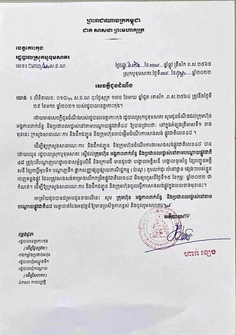 ដោយមានសេចក្តីជូនដំណឹងរបស់រដ្ឋបាលខេត្តកោះកុងរដ្ឋបាលស្រុកបូទុមសាគរ សូមជូនដំណឹងដល់ក្រុមហ៊ុនអង្គភាពពាក់ព័ន្ធ និងប្រជាពលរស់នៅតាមបណ្ដោយផ្លូវ៤៨ឱ្យបានជ្រាបថា៖ នៅក្នុងអំឡុងត្រីមាសទី១ ខាងមុខនេះក្រសួងសាធារណៈការ និងដឹកជញ្ជូន និងក្រុមហ៊ុនចាប់ផ្ដើមដំណើរការសាងសង់ផ្លូវជាតិ៤៨