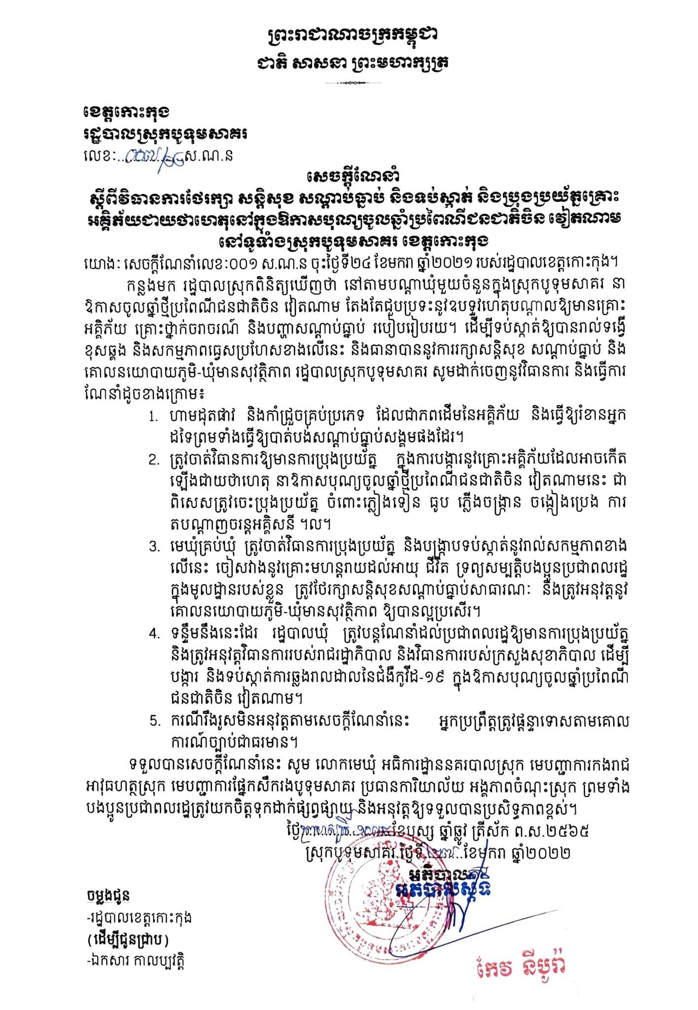 សេចក្តីជូនដំណឹងរបស់រដ្ឋបាលស្រុកបូទុមសាគរ ស្ដីពីការការពារសន្តិសុខសណ្ដាប់ធ្នាប់ក្នុងឱកាសបុណ្យចូលឆ្នាំប្រពៃណីជនជាតិចិន វៀតណាម ឆ្នាំ ២០២២