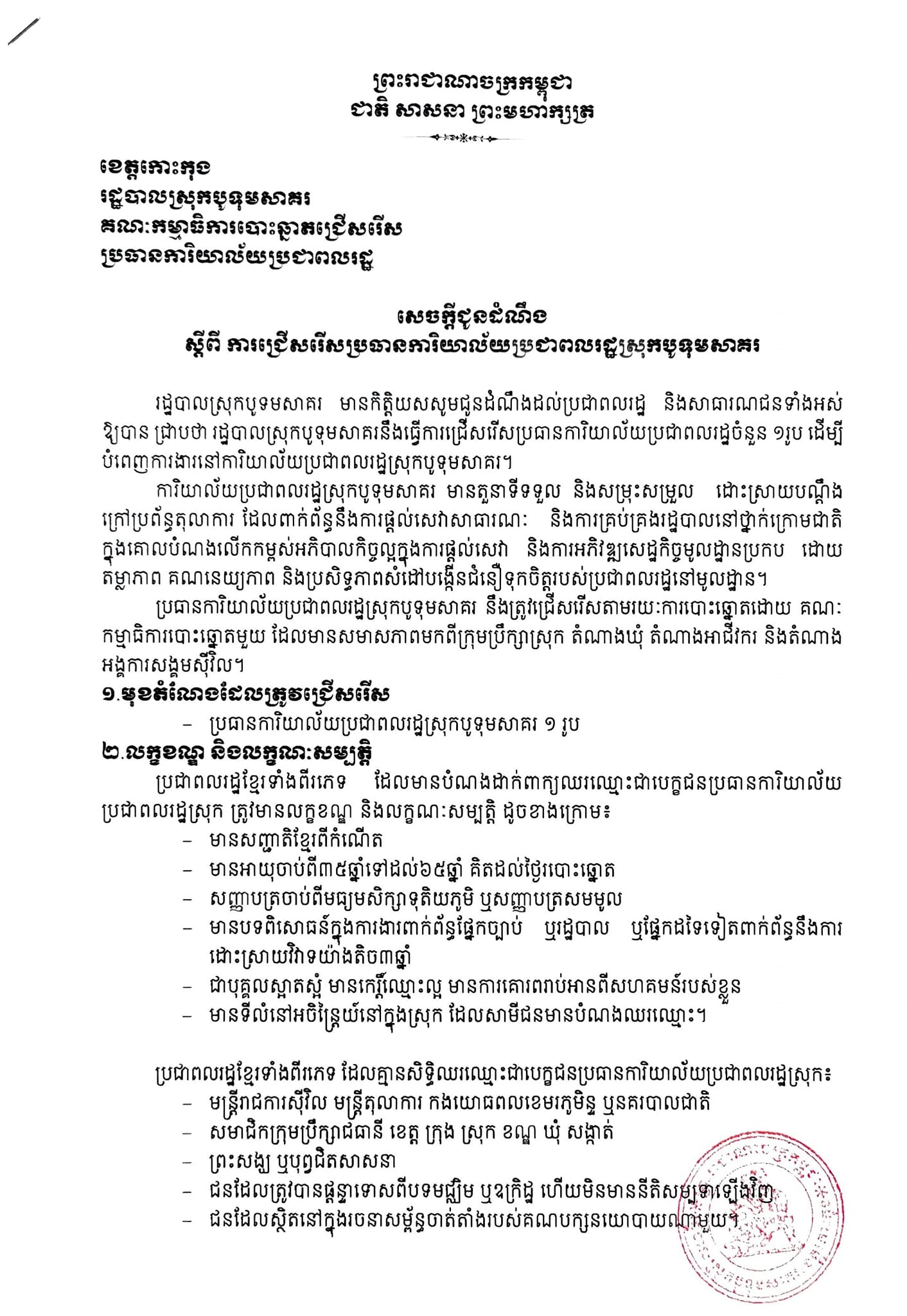 រដ្ឋបាលស្រុកបូទុមសាគរ មានកិត្តិយសសូមជូនដំណឹងដល់ប្រជាពលរដ្ឋ និងសាធារណជន ទាំងអស់ឱ្យបានជ្រាបថាៈ រដ្ឋបាលស្រុកបូទុមសាគរនឹងធ្វើការជ្រើសរើសប្រធានការិយាល័យប្រជាពលរដ្ឋចំនួន ០១រូប ដើម្បីបំពេញការងារនៅការិយាល័យប្រជាពលរដ្ឋស្រុកបូទុមសាគរ ស្ថិតនៅភូមិអណ្តូងទឹក ស្រុកបូទុមសាគរ ខេត្តកោះកុង