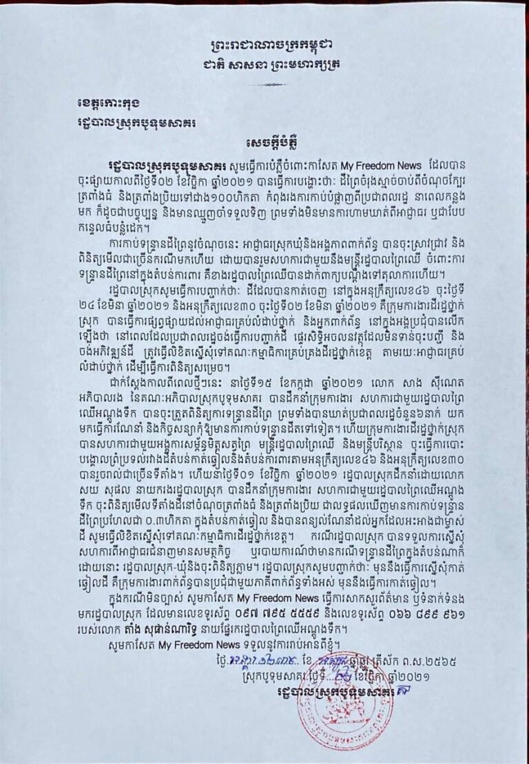 រដ្ឋបាលស្រុកបូទុមសាគរ សូមធ្វើការបំភ្លឺចំពោះកាសែត My Freedom News ដែលបានចុះផ្សាយកាលពីថ្ងៃទី០២ ខែវិច្ឆិកា ឆ្នាំ២០២១ បានធ្វើការបង្ហោះថាៈ ដីព្រៃចំរុងស្មាច់ចាប់ពីចំណុចក្បែរ ត្រពាំងធំ និងត្រពាំងប្រិយទៅជាង១០០ហិកតា កំពុងរងការកាប់បំផ្លាញពីប្រជាពលរដ្ឋ នាពេលកន្លងមក