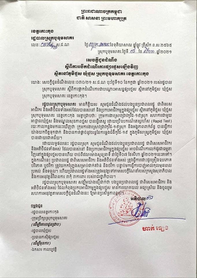 រដ្ឋបាលស្រុកបូទុមសាគរ មានកិត្តិយស សូមជម្រាបជូនដល់បងប្អូនប្រជាពលរដ្ឋក្នុងមូលដ្ឋានស្រុកបូទុមសាគរ ជាពិសេសប្រជាពលរដ្ឋទូទាំងឃុំថ្មស មេត្តាជ្រាបថាៈ រដ្ឋបាលស្រុក បានធ្វើការបិទជាបណ្តោះអាសន្នការធ្វើដំណើរចេញ-ចូល ក្នុងភូមិសាស្រ្តចំណុចគ្រួសក្រហម ស្ថិតនៅក្នុងភូមិចម្លងគោ
