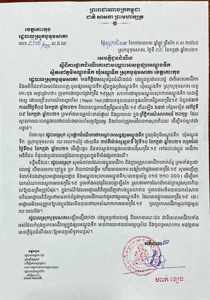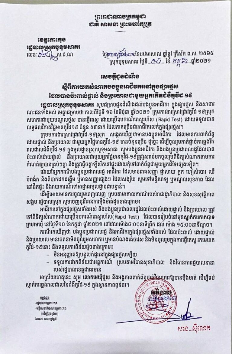 រដ្ឋបាលស្រុកបូទុមសាគរ សូមជូនសេចក្តីជូនដំណឹង ស្ដីពីការយកសំណាកបងប្អូនអាជីវករនៅក្នុងផ្សារអណ្ដូងទឹក និង ផ្សារថ្មស ដែលបានប៉ះពាល់ផ្ទាល់ និងប្រយោលជាមួយអ្នកកើតជំងឺកូវីដ-១៩