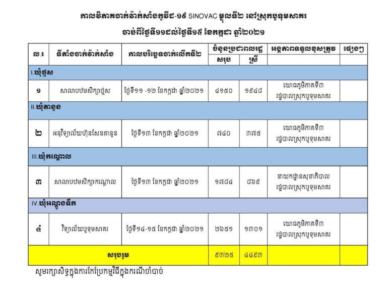 រដ្ឋបាលស្រុកបូទុមសាគរ សូមជូនសេចក្តីជូនដំណឹង ការចាក់វ៉ាក់សាំងលើកទី២ នៃស្រុកបូទុមសាគរ និងប្រព្រឹត្តទៅចាប់ពីថ្ងៃទី១១ ខែកក្កដា ឆ្នាំ២០២១ ដល់ថ្ងៃទី១៥ ខែកក្កដា ឆ្នាំ២០២១
