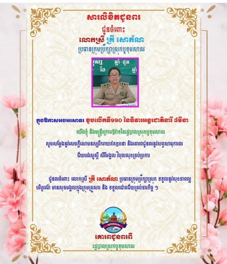 សារជូនពរ ជូនចំពោះ លោកស្រី គ្រី សោភ័ណ ប្រធានក្រុមប្រឹក្សាស្រុកបូទុមសាគរ ក្នុងឱកាសអបអរសាទរខួបទី ១១០ ទិវាអន្តរជាតិនារី ៨ មីនា ឆ្នាំ២០២១