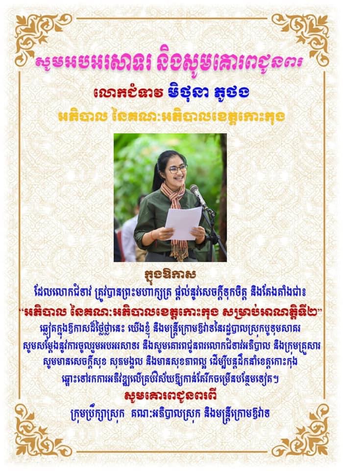 រដ្ឋបាលស្រុកបូទុមសាគរ សូមចូលរួមអបអរសាទរ លោកជំទាវ មិថុនា ភូថង ដែលត្រូវបានព្រះមហាក្សត្រ តែងតាំងជាអភិបាល នៃគណៈអភិបាលខេត្តកោះកុង សម្រាប់អាណត្តិទី២
