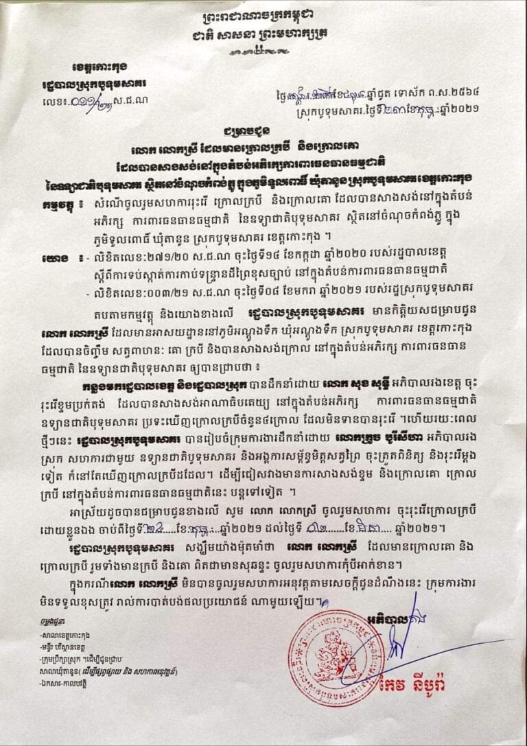 រដ្ឋបាលស្រុកបូទុមសាគរ សូមជម្រាបជូន លោក លោកស្រីដែលមានក្រោលគោ ក្របី ដែលបានសាងសង់នៅក្នុងតំបន់អភិរក្សការពារធនធានធម្មជាតិ នៃឧទ្យានជាតិបូទុមសាគរ