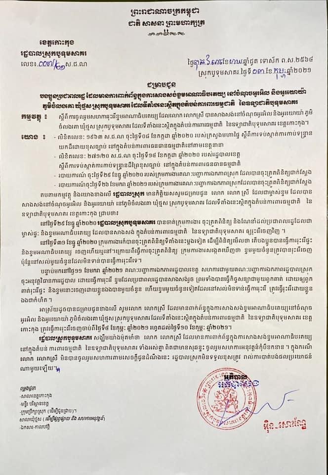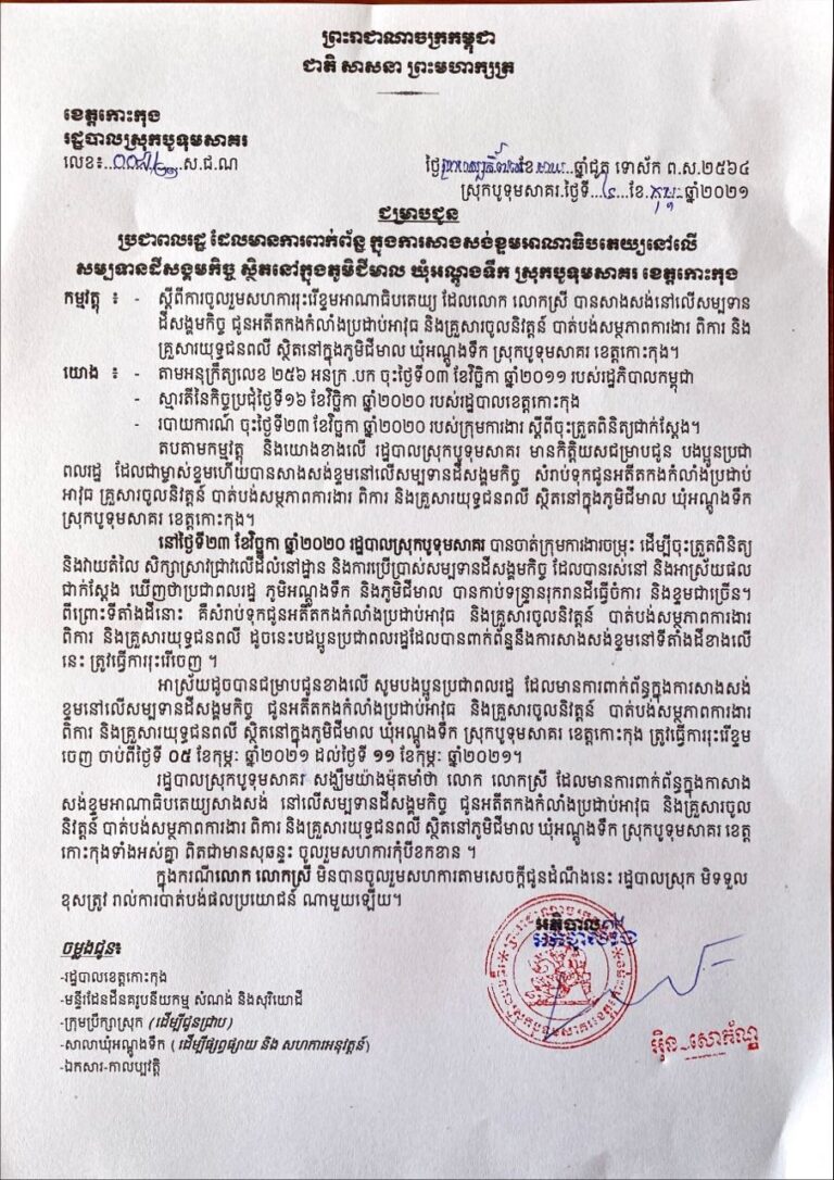 រដ្ឋបាលស្រុកបូទុមសាគរ សូមជម្រាបជូនដំណឹង ដល់ប្រជាពលរដ្ឋ ដែលមានការពាក់ព័ន្ធ ក្នុងការសាងសង់ខ្ទមអាណាធិបតេយ្យនៅលើ សម្បទានដីសង្គមកិច្ច ស្ថិតនៅក្នុងភូមិជីមាល