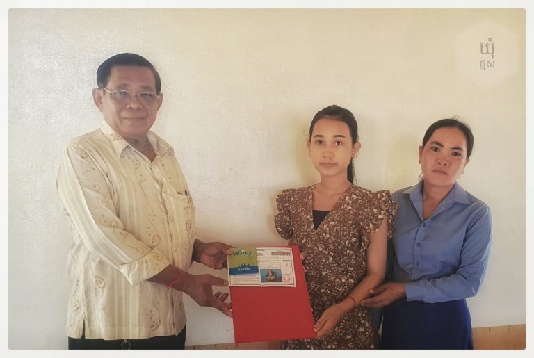 លោក អិក កួន មេឃុំថ្មស បានផ្ដល់កាតវីងជូនប្រជាពលរដ្ឋភូមិថ្មស ដែលបានមកពិនិត្យផ្ទៃពោះ នៅមណ្ឌលសុខភាពថ្មស ឈ្មោះ ម៉ែន សុផារី