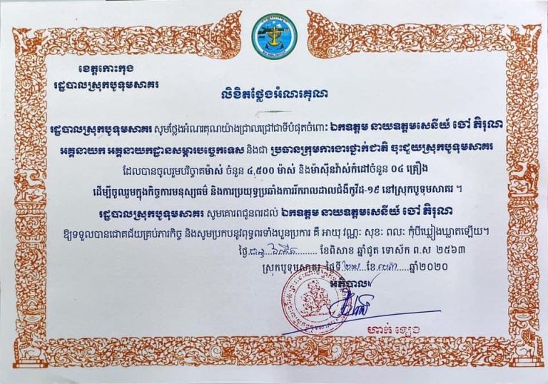 ឯកឧត្ដម ឧត្តមសេនីយ៍ ចៅ ភិរុណ អគ្គនាយក អគ្គនាយកដ្ឋានសម្ភារបច្ចេកទេស និងជាប្រធានក្រុមការងារថ្នាក់ជាតិ ចុះជួយស្រុកបូទុមសាគរ និងលោកជំទាវ ដែលបានចូលរួមបរិច្ចាគម៉ាស់ចំនួន ៤,៥០០ម៉ាស់ និងម៉ាស៊ីនវ៉ាស់កំដៅចំនួន ០៤គ្រឿង ដើម្បីចូលរួមក្នុងកិច្ចការមនុស្សធម៌ និងការប្រយុទ្ធប្រឆាំងការរីករាលដាលជំងឺកូវីដ-១៩ នៅស្រុកបូទុមសាគរ