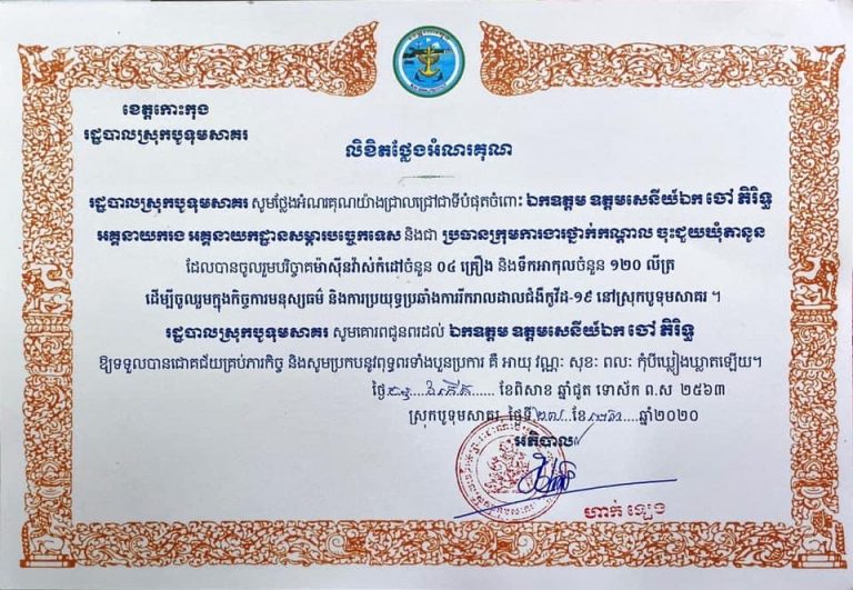 លោក វាំង វីរះ មេឃុំតានូន បានផ្តល់កាតវីងនិងអត្រានុកូលដ្ឋានកំណើតទារក ដល់ស្រី្តក្រីក្រសំរាលកូនស្ថិតនៅក្នុងភូមិទួលពោធិ៍ ឃុំតានូន ស្រុក ូទុមសាគរ ខេត្តកោះកុង