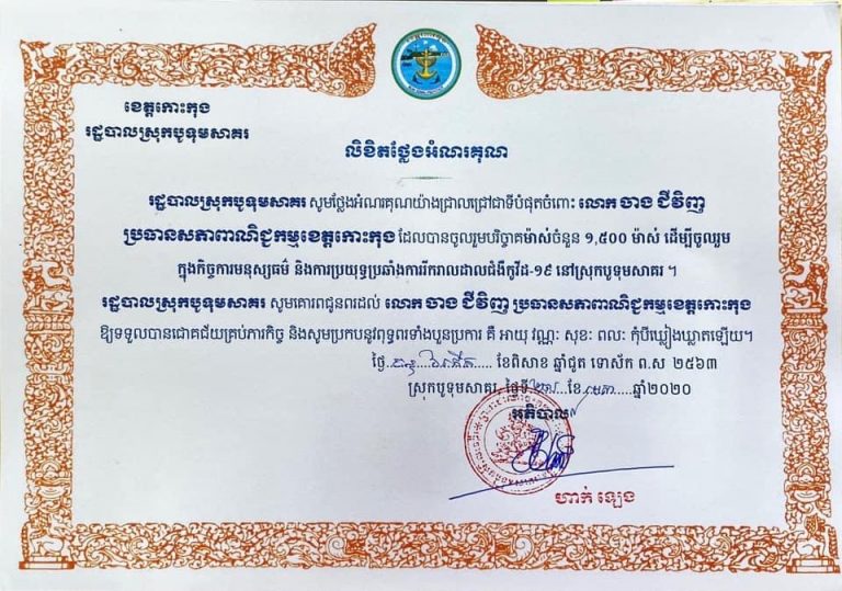 លោក ចាង ជីវិញ ប្រធានសភា ពាណិជ្ជកម្មខេត្តកោះកុង ដែលបានចូលរួមបរិច្ចាគម៉ាស់ចំនួន ១,៥០០ម៉ាស់ ដើម្បីចូលរួមក្នុងកិច្ចការមនុស្សធម៌ និងការប្រយុទ្ធប្រឆាំងការរីករាលដាលជំងឺកូវីដ-១៩ នៅស្រុកបូទុមសាគរ