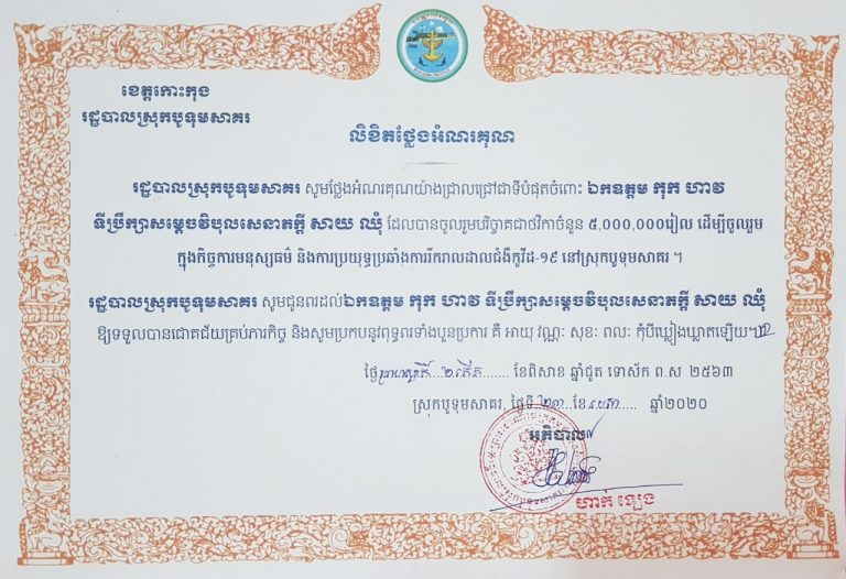រដ្ឋបាលស្រុកបូទុមសាគរ សូមថ្លែងអំណរគុណយ៉ាងជ្រាលជ្រៅជាទីបំផុតចំពោះ ឯកឧត្ដម កុក ហាវ ទីប្រឹក្សាសម្ដេចវិបុលសេនាភក្ដី សាយ ឈុំ ដែលបានចូលរួមបរិច្ចាគជាថវិកាចំនួន ៥,០០០,០០០រៀល ដើម្បីចូលរួមក្នុងកិច្ចការមនុស្សធម៌ និងការប្រយុទ្ធប្រឆាំងការរីករាលដាលជំងឺកូវីដ-១៩ នៅស្រុកបូទុមសាគរ
