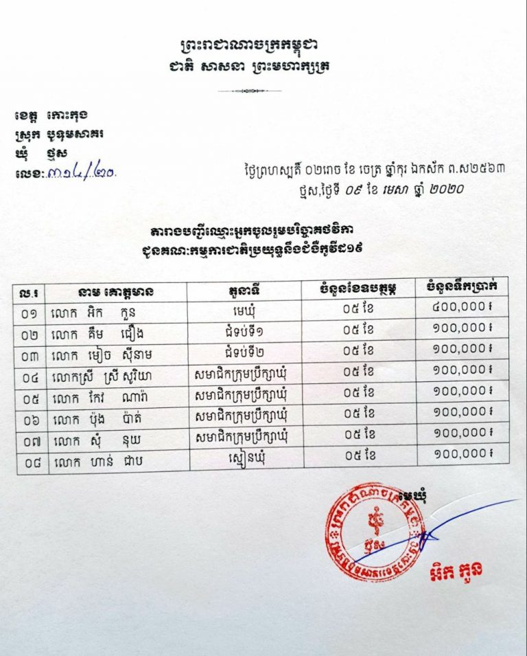 រដ្ឋបាលឃុំថ្មស នៃស្រុកបូទុមសាគរ ខេត្តកោះកុង សូមធ្វើការបរិច្ចាគប្រាក់បៀវត្សប្រចាំខែរបស់ខ្លួន មានដូចក្នុងតារាងរាយនាមឈ្មោះខាងលើ រយៈពេល០៥ខែ ចាប់ពីខែឧសភា ដល់ខែកញ្ញា ឆ្នាំ២០២០ ជូនគណៈកម្មការជាតិប្រយុទ្ធនឹងជំងឺកូវីដ-១៩(Covid-19)
