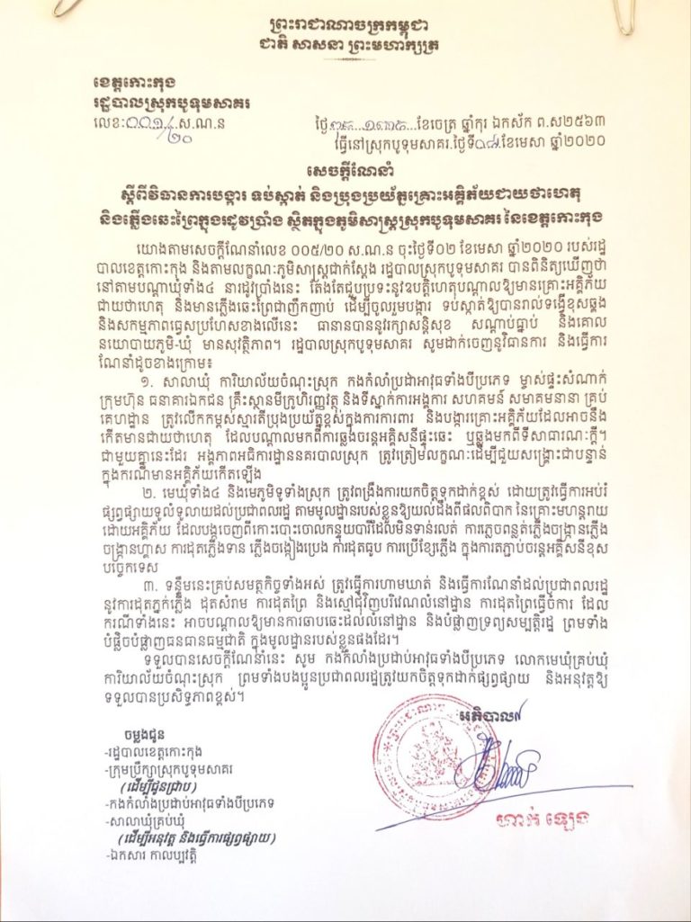រដ្ឋបាលស្រុកបូទុមសាគរ បានចេញ សេចក្តីណែនាំ លេខ: ០០១/២០ ស.ណ.ន វិធានការបង្ការ ទប់ស្គាត់ និងប្រុងប្រយ័ត្នគ្រោះអគ្គិភ័យជាយថាហេតុ និងភ្លើងឆេះព្រៃក្នុងរដូវប្រាំងស្ថិតក្នុងភូមិសាស្ត្រស្រុកបូទុមសាគរ នៃខេត្តកោះកុង