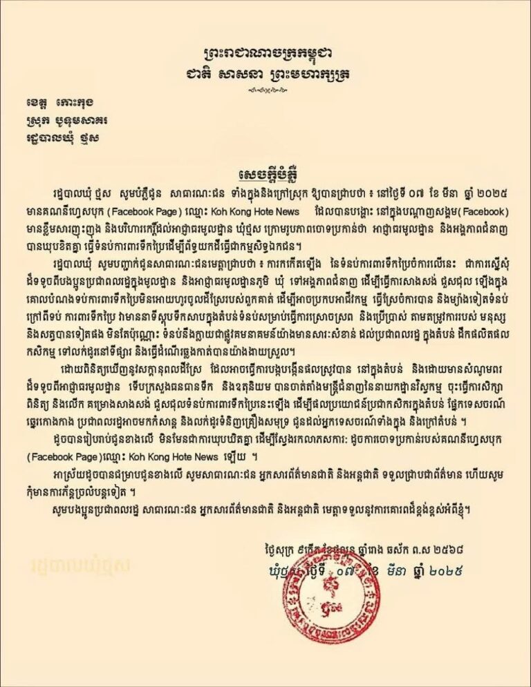 រដ្ឋបាលឃុំថ្មស សូមបំភ្លឺជូនសាធារណៈជន ទាំងក្នុងនិងក្រៅស្រុក ឱ្យបានជ្រាបថា៖ គណនីហ្វេសបុក (Facebook Page) ឈ្មោះ Koh Kong Hote News ដែលបានបង្ហោះ នៅក្នុងបណ្ដាញសង្គម(Facebook)