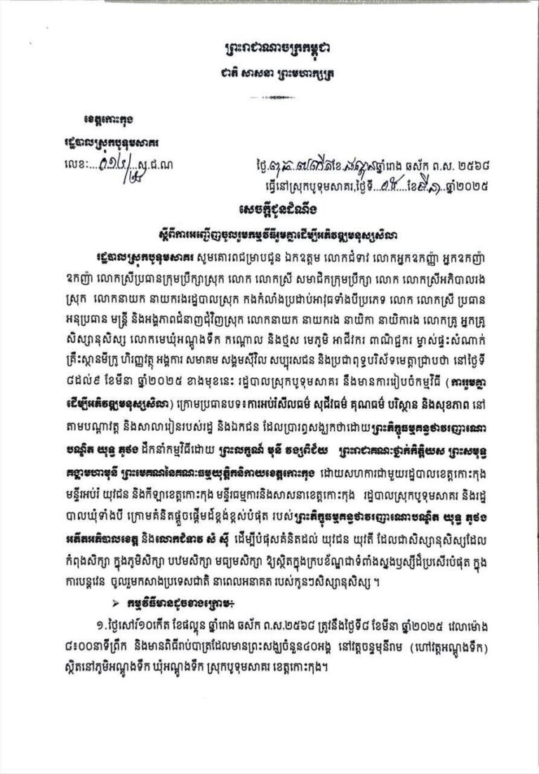 លោក ក្រូច បូរីសីហា អភិបាល នៃគណ:អភិបាលស្រុកបូទុមសាគរ បានដឹកនាំប្រធានការិយាអប់រំយុវជន និងកីឡាស្រុក នាយកវិទ្យាល័យ ហ៊ុន សែន ចំការលើ និងមត្តេយ្យធនធានថ្មស ចូលរួម ពិធីប្រកាសជ័យលាភីអង្គភាពផ្តល់សេវាសាធារណៈគំរូក្នុងវិស័យអប់រំ និងវិស័យសុខាភិបាលឆ្នាំ២០២៤ និងការប្រកាសដាក់ឲ្យអនុវត្ត សម្រាប់ឆ្នាំ២០២៥