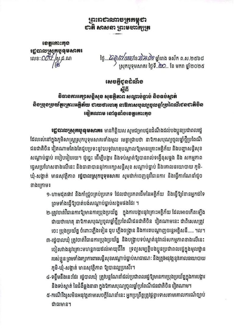 សេចក្តីជូនដំណឹង ស្តីពី វិធានការរក្សាសន្តិសុខ សុវត្ថិភាព សណ្តាប់ធ្នាប់ និងទប់ស្កាត់ និងប្រុងប្រយ័ត្នគ្រោះអគ្គិភ័យ ជាយថាហេតុ នាឱកាសបុណ្យចូលឆ្នាំប្រពៃណីជនជាតិចិន វៀតណាម នៅទូទាំងខេត្តកោះកុងរដ្ឋបាលស្រុកបូទុមសាគរ មានកិត្តិយស សូមជម្រាបជូនដំណឹងដល់បងប្អូនប្រជាពលរដ្ឋដែលរស់នៅក្នុងភូមិសាស្ត្រស្រុកបូទុមសាគរទាំងមូល មេត្តាជ្រាបថា នាឱកាសបុណ្យចូលឆ្នាំថ្មីប្រពៃណីជនជាតិចិន វៀតណាមតែងតែជួបប្រទះនូវឧបទ្ទវហេតុបណ្តាលឱ្យមានគ្រោះអគ្គិភ័យ និងបញ្ហាសន្តិសុខ សណ្តាប់ធ្នាប់ របៀបរៀបរយ