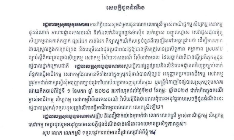 សេចក្តីជូនដំណឹងរដ្ឋបាលស្រុកបូទុមសាគរ មានកិត្តិយសសូមជម្រាបជូនលោកលោកស្រី ម្ចាស់ពាណិជ្ជកម្ម សិប្បកម្ម សេវាកម្ម ផ្ទះសំណាក់ អាហារដ្ឋានទេសចរណ៍ ទីតាំងលក់និងប្តូរប្រេងម៉ាស៊ីន លក់ហ្គាស បញ្ចូលហ្គាស សេវាជួសជុលម៉ូតូ សិប្បកម្មជាងកាត់កញ្ចក់ ផ្សារដែក កាត់ដែក កីឡាស្នូកយ័រកំសាន្តចំនួនពីរតុឡើងទៅមេត្តាជ្រាបថា ដើម្បីមានភាព ងាយស្រួលក្នុងការគ្រប់គ្រង និងបម្រើសេវាជូនប្រជាពលរដ្ឋឱ្យបានត្រឹមត្រូវមានប្រសិទ្ធភាព តម្លាភាព ស្របតាម ច្បាប់ស្តីពីការគ្រប់គ្រងសិប្បកម្ម សេវាកម្ម វិស័យទេសចរណ៍ វិស័យថាមពល ដែលថ្នាក់ជាតិបានធ្វើប្រតិភូកម្មជូន រដ្ឋបាលថ្នាក់ក្រោមជាតិ